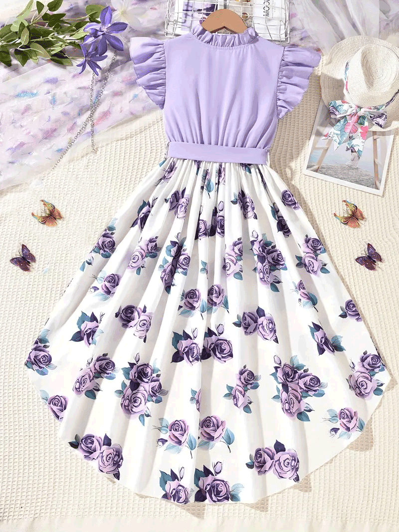 Fashionable Girls Floral Splicing Dress with Ruffled Detail & Adjustable Belt 1731