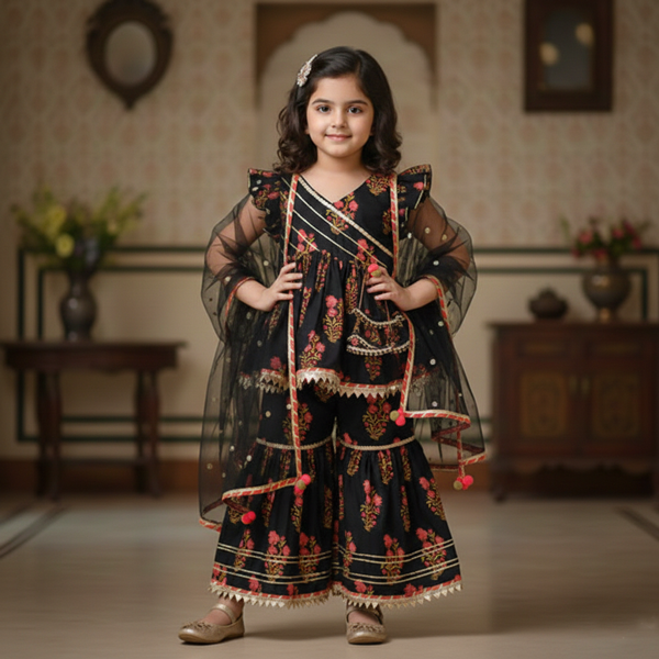 - Vibrant Blossom Ensemble: Multicolor Floral Top with Sharara and Gota Lace Dupatta 1902