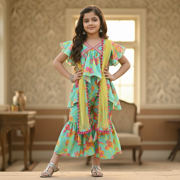 Vibrant Blossom Ensemble: Multicolor Floral Top with Sharara and Gota Lace Dupatta 1904